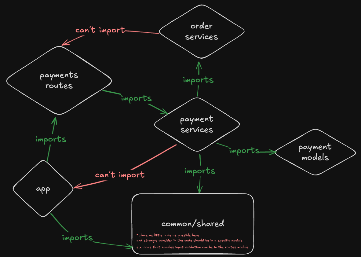 This creates a circular dependency that makes the code harder to test, refactor, and understand. Routes should only import from your modules (orders, payments, etc.), never from the main application file.